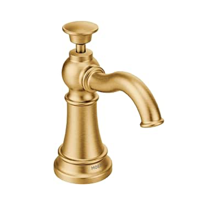 Dispense soap or lotion directly from your sink with the Moen Kitchen Soap and Lotion Dispenser. This built-in soap dispenser refills easily from the countertop and offers an elegant design with a gently curved spout that complements a wide variety of faucets. The undermount dispenser requires only one hole for installation and includes a refillable 18-ounce bottle.