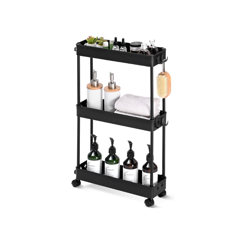 The 3 tier rolling utility cart boasts a high quality plastic shelves and sturdy durable powder-coated steel frame and that are strong and built to last. Great for use in your bathroom, laundry room, kitchen, office, in-between washer and dryer, narrow small places,etc.